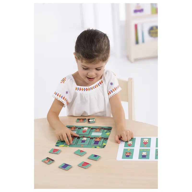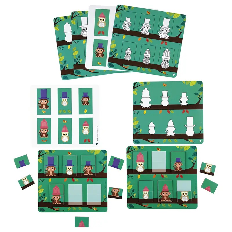 Děti umisťují obyvatele stromu na větve pomocí magnetických dílků a instrukcí na oboustranných předlohových kartách, které umožňují samo-korekci.