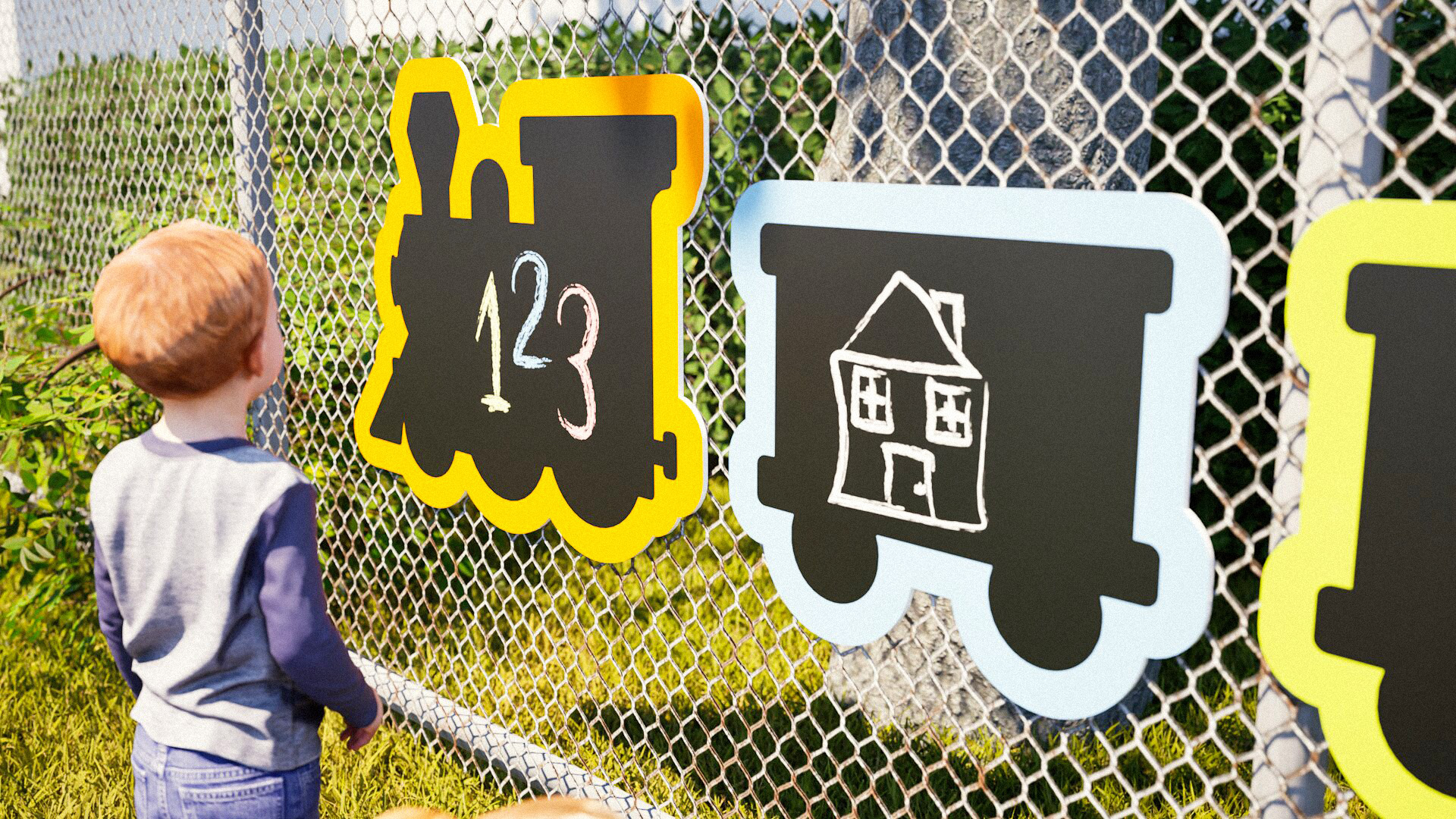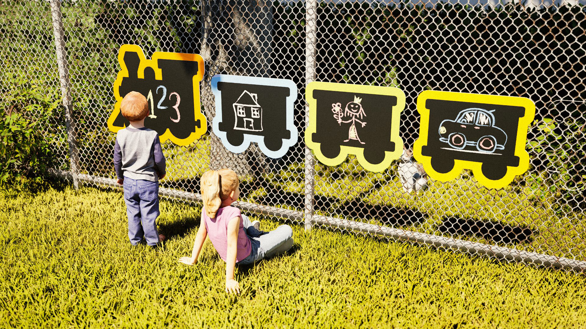 Tato sada čtyř venkovních tabulí s motivy vlaku se skládá z lokomotivy a tří vagónů. Ideální pro školky, dětská hřiště nebo zahrady. Tabule slouží jako prostor pro kreslení křídou a podporují kreativitu a spontánní výtvarné vyjádření dětí. Každá tabule má kreslící plochu o průměru 46 cm a je vyrobena z lehkého a odolného materiálu, který je vhodný pro venkovní použití. Povrch je určený na venkovní použití a odolný vůči povětrnostním vlivům, což zajišťuje dlouhou životnost i při celoročním umístění venku. Díky veselým motivům a praktickému provedení se tyto tabule stanou oblíbeným a funkčním doplňkem každého dětského venkovního prostoru.