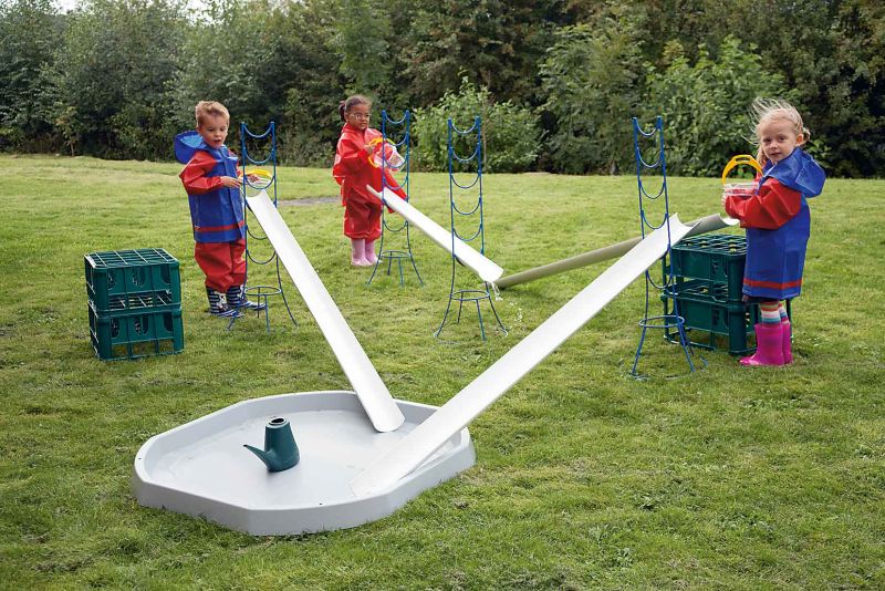 Díky těmto stojanům si děti mohou sestavit vodní cestu podle vlastní fantazie a zkoušet různé varianty toku – od přímých úseků až po složitější zakřivené dráhy. Experimentování s výškou a sklonem pomáhá dětem pochopit základní fyzikální principy, jako je gravitace a směr proudění vody. Jeden stojan lze použít jako podpěru jednoho konce žlabu, proto pro delší vodní cesty doporučujeme více stojanů.